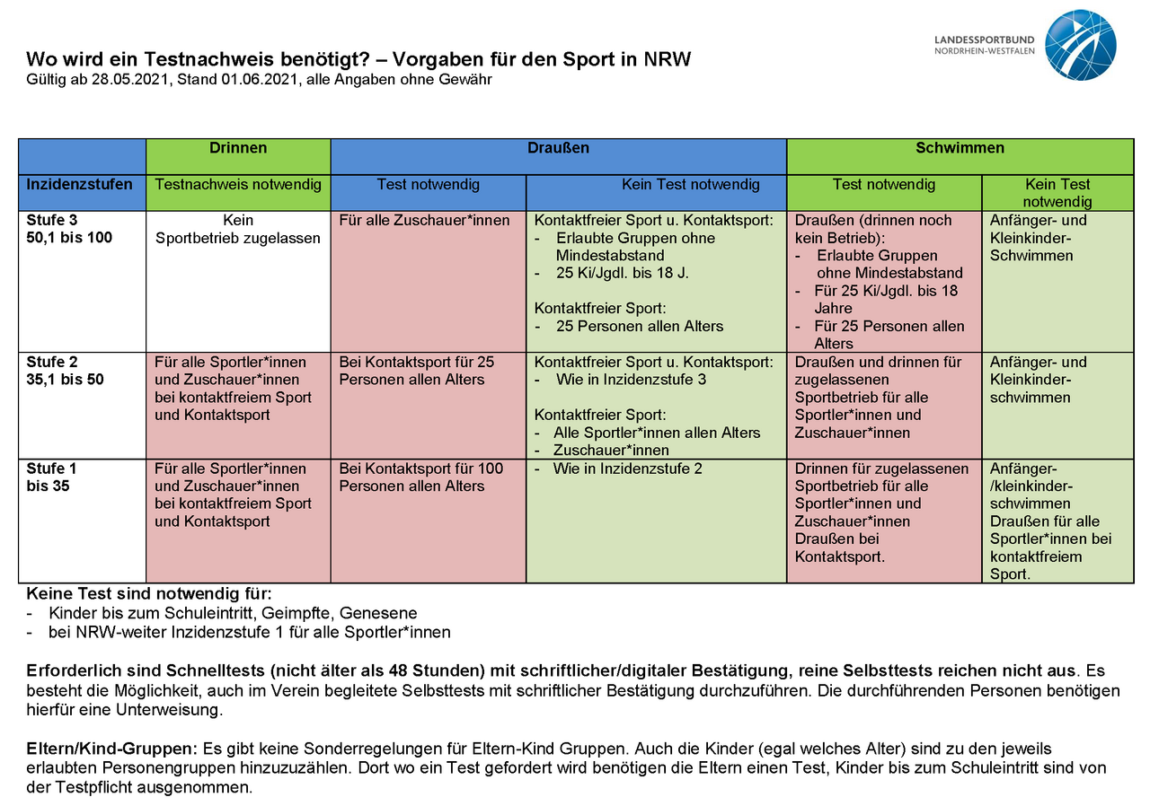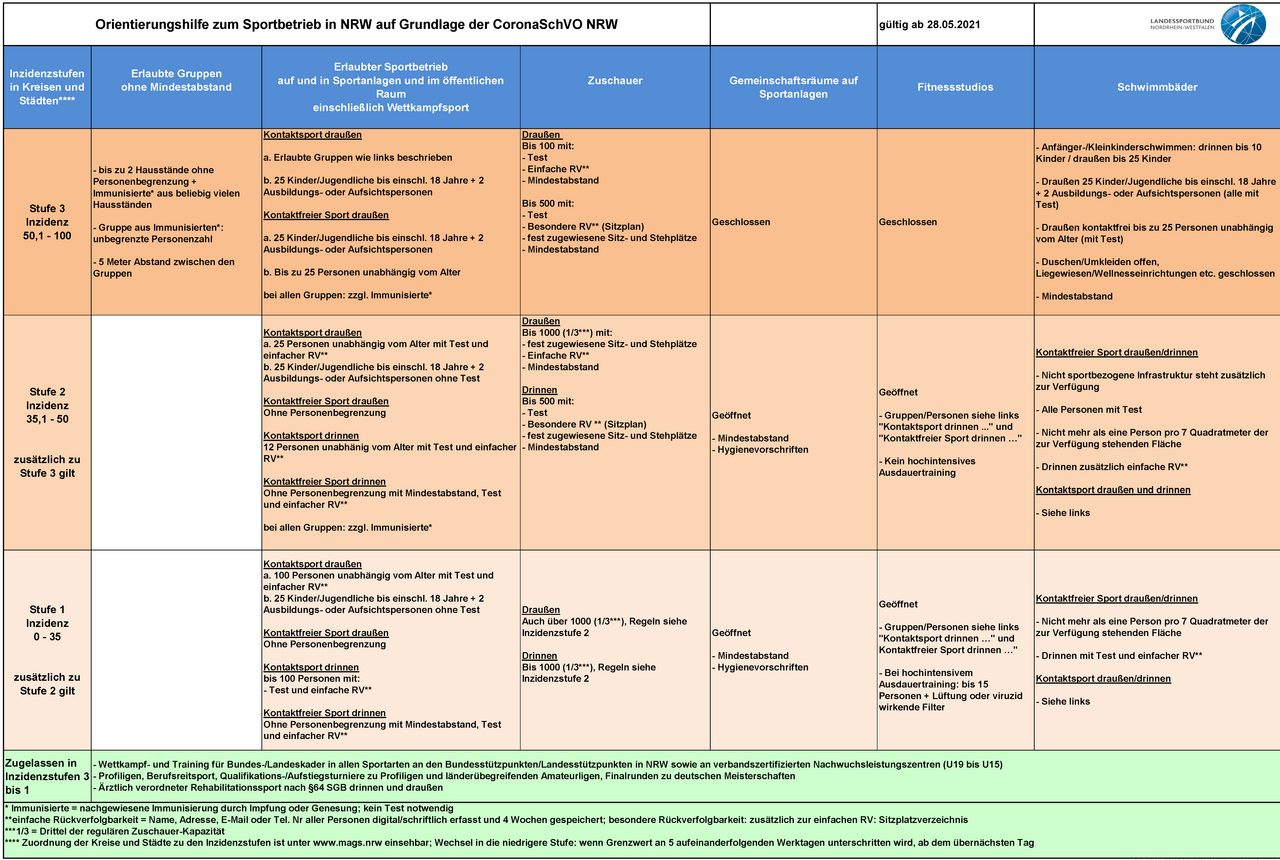 Die neue Coronaschutzverordnung (CoronaSchVO) sieht weitreichende Lockerungen für den Sport in NRW vor, sobald die regionale 7-Tage-Inzidenz (also die Inzidenz in einem Kreis oder einer kreisfreien Stadt) stabil unter 50 liegt.