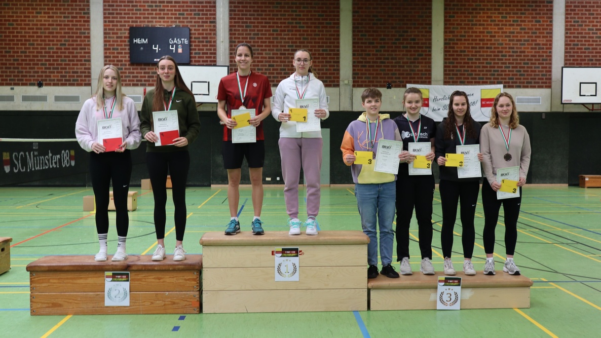 Im Finale des Damendoppels schlugen die Doppel Jule Marie Giebeler und Lena Schornstein (TV Hoffn. Littfeld) sowie Selina Giesler und Sophie Heidebrecht (1. BC Beuel, PSV Gelsenk.-Buer) am Sonntag auf. Erstere Paarung hatte sich zuvor im Halbfinale gegen Jule Alberts und Finja Rosendahl (VfB GW Mühlheim, Gladbecker FC) in drei Sätzen durchgesetzt. Das Doppel aus Beuel und Gelsenkirchen-Buer gewann in ihrem Halbfinale gegen Anika Pfennings und Marie Wintergalen (SC BW Ostenland, BC Herringen) in zwei Sätzen. Im abschließenden Finale gewannen Giesler und Heidebrecht gegen Giebeler und Schornstein zu 14 und 18 Punkten. Damit holte sich Selina Giesler die zweite Goldmedaille des Wochenendes.