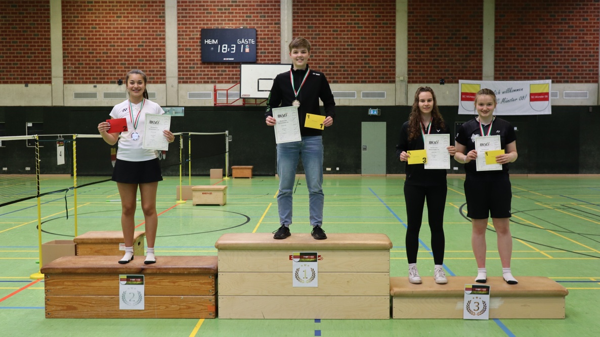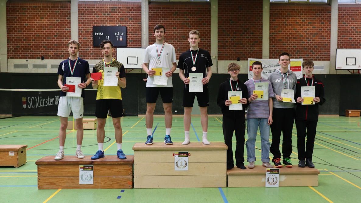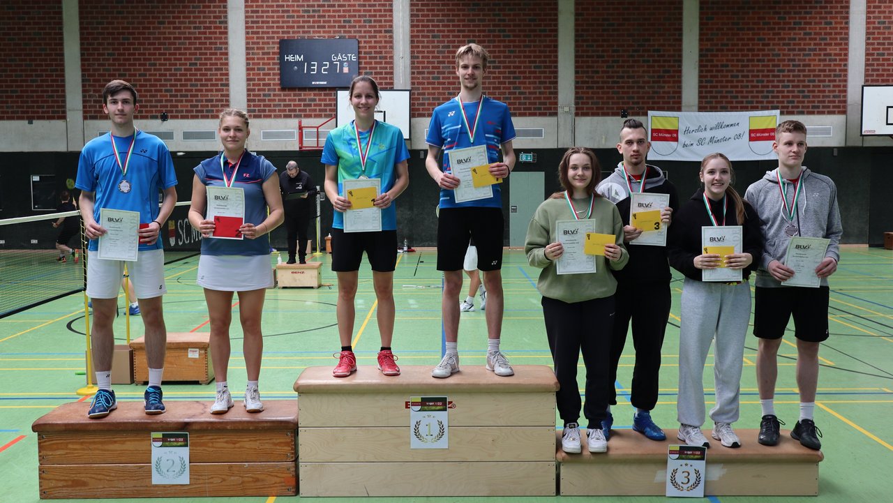 Die Ehrung der glücklichen Sieger:innen wurde von Miles Eggers (Badminton NRW), Jan Striewski (Badminton NRW) und Stefan Dudenhausen (SC Münster 08) vorgenommen. Der SC Münster 08 gratuliert allen Platzierten des Wochenendes ganz herzlich und bedankt sich für das Engagement der vielen ehrenamtlichen Helfer:innen, die eine Ausrichtung des Turniers ermöglicht haben.