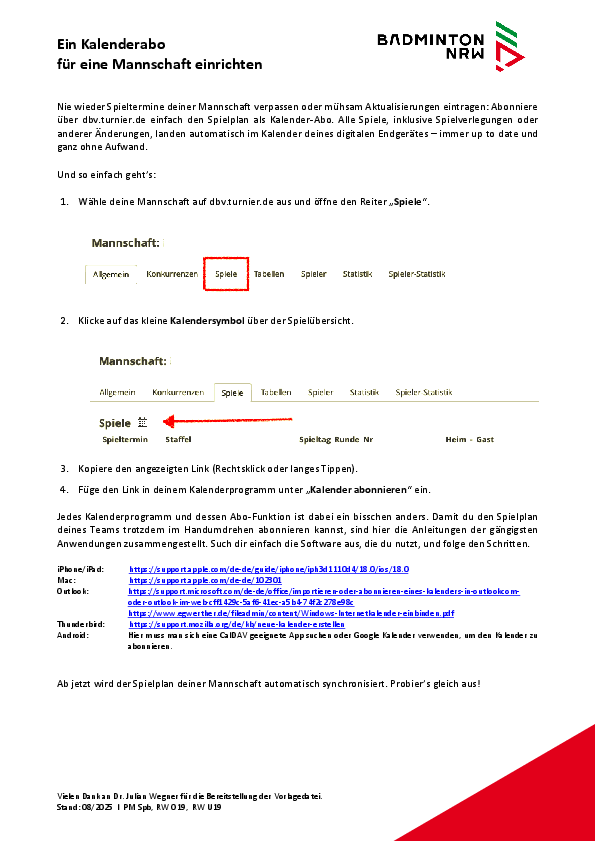 Nie wieder Spieltermine deiner Mannschaft verpassen oder mühsam Aktualisierungen eintragen: Abonniere über dbv.turnier.de einfach den Spielplan als Kalender-Abo. Alle Spiele, inklusive Spielverlegungen oder anderer Änderungen, landen automatisch im Kalender deines digitalen Endgerätes – immer up to date und ganz ohne Aufwand.
