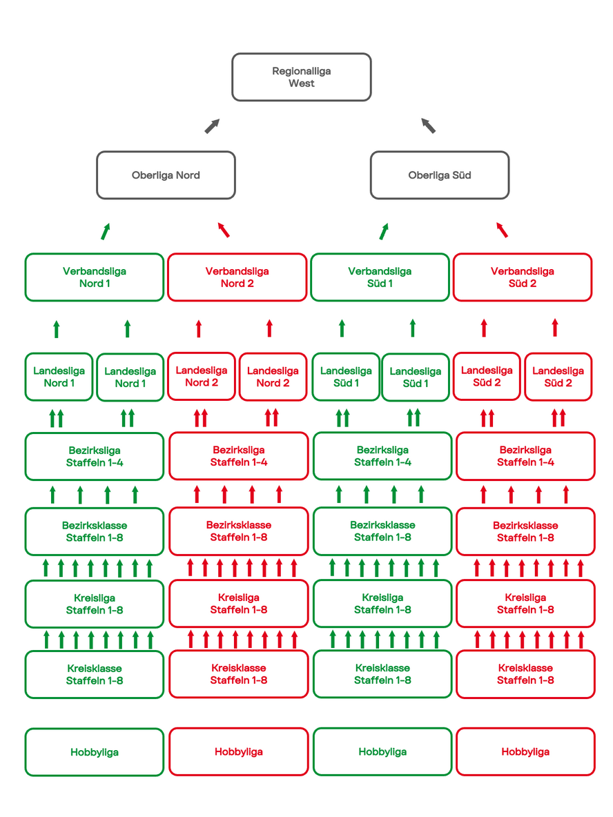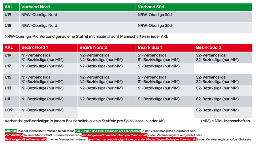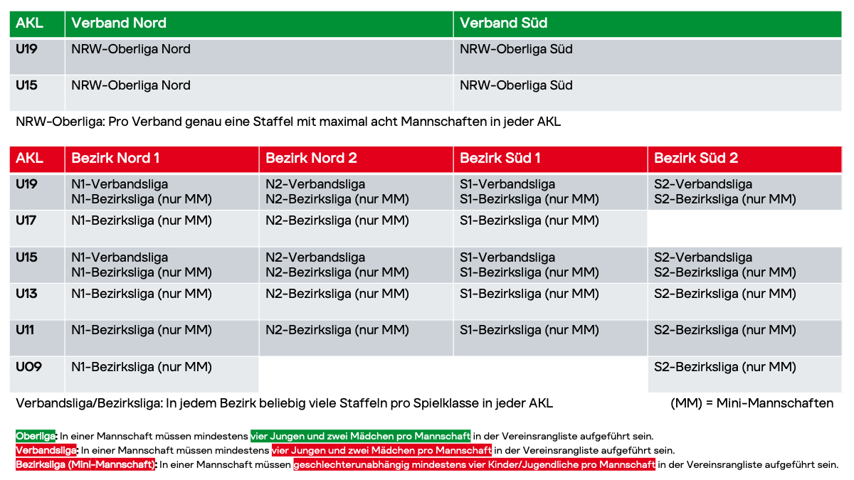 Der Altersklassenbereich U19 ist ebenfalls im Ligabetrieb engagiert. Die Spielklasseneinteilung unterscheidet sich vom O19-Spielbetrieb vor allem dadurch, dass es zwar Meister, aber keinen Auf- und Abstieg gibt. In jedem Jahr sind alle Mannschaften neu zu melden. Dabei sind alle Spielklassen meldeoffen.